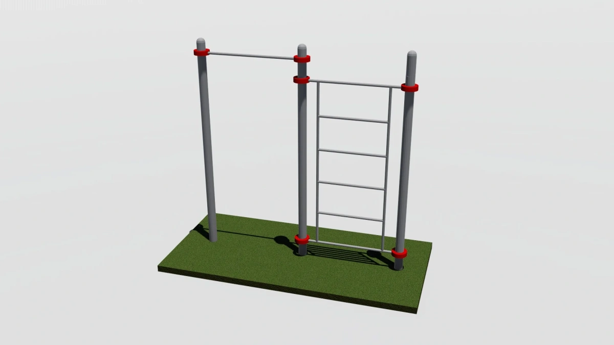К опорным столбам высотой 2600мм крепятся с помощью хомутов на высоте от уровня основания: 2550 мм – перекладина туника шириной 1200 мм, 2400 мм –шведская стенка. Ширина шведской стенки 1200 мм. Шаг составляет – 34 см. Общая длина комплекса составляет не более 2700 мм.