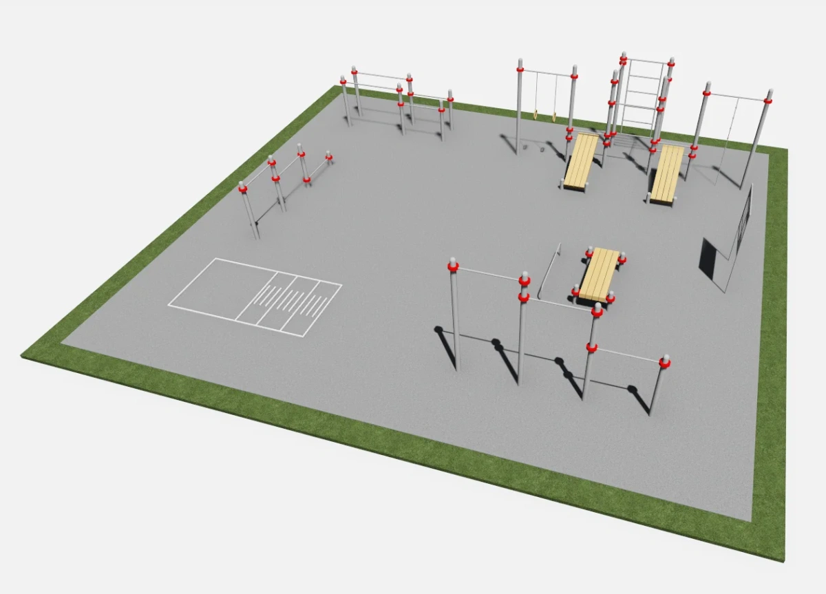 Спортивная площадка включает тренажеры: СК017, Т004, Т005, Б003, Б010, СК006.