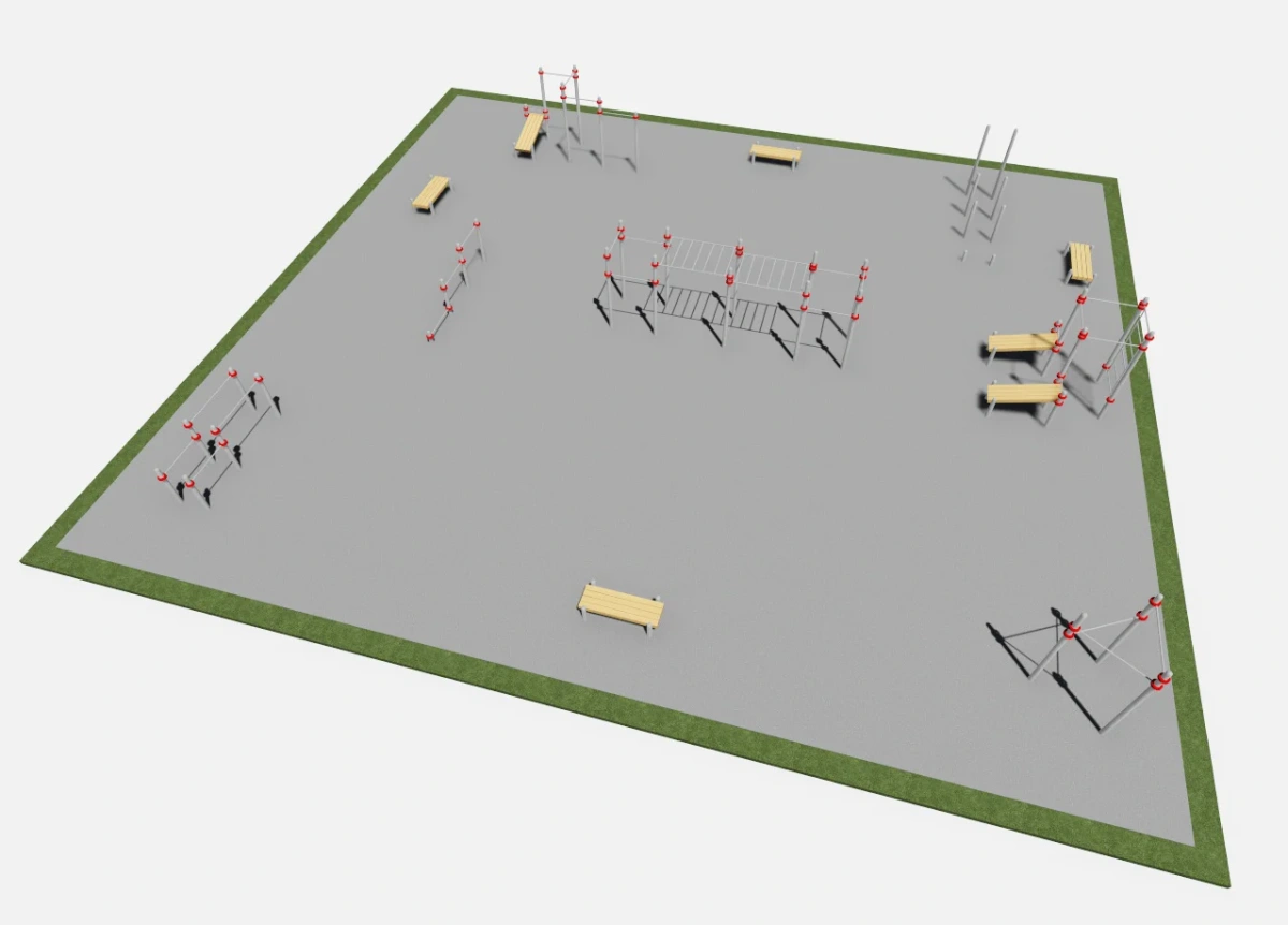 Спортивная площадка включает тренажеры: Б003, Р002, СК001- 4 шт., Т005, Б007, Т007, СК019, СК003.