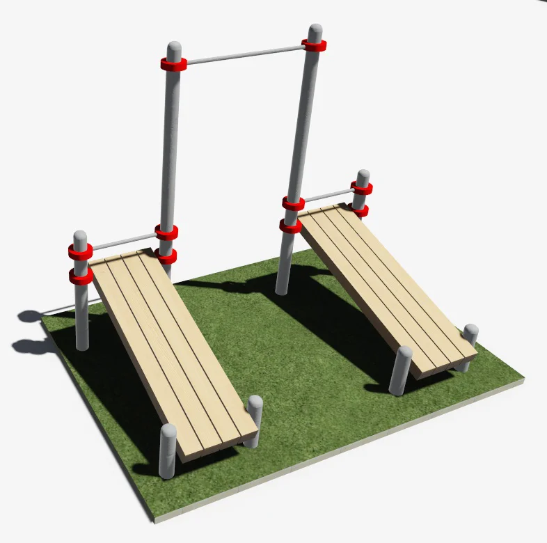 Перекладина турника для подтягиваний крепится на высоте 2500 мм от уровня основания к опорным столбам высотой 2600 мм. Высота фиксации скамьи составляет: 1100 мм и 400 мм от уровня основания к опорным столбам высотой 2 шт.-2600 мм, 2 шт. – 1500 мм и 4 шт.- 500 мм. Перекладина для фиксации ног крепится на высоте 1300 мм от поверхности основания. Лавка представляет собой деревянный брус размером 450мм*1800мм сечением 140*50 мм. Крепление элементов данного комплекса осуществляется при помощи хомутов. Длина комплекса не более 2600 мм.