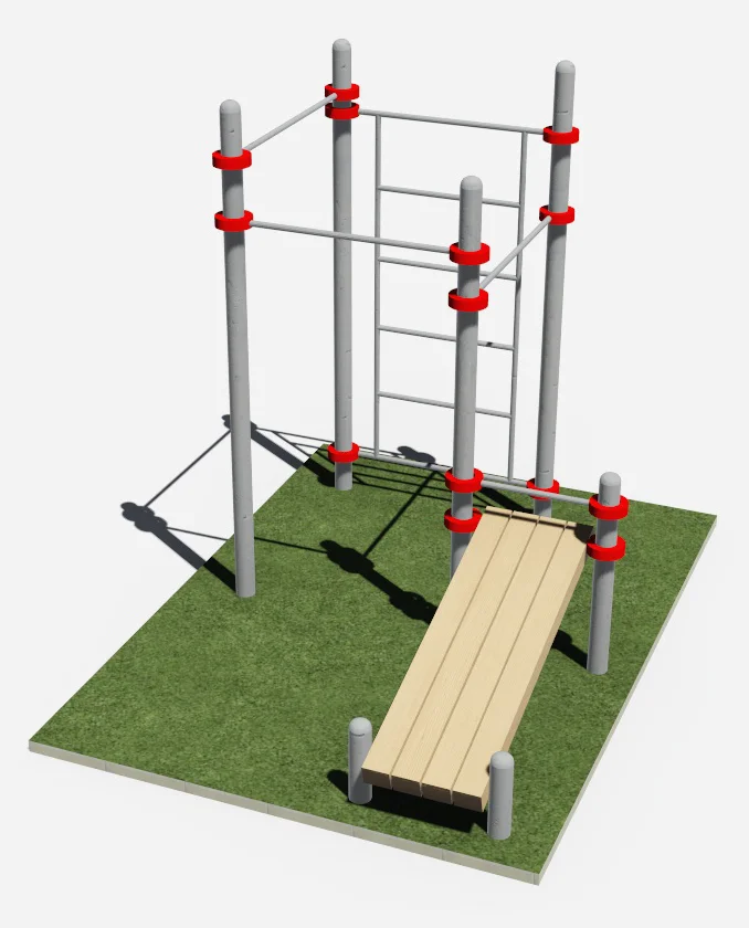 Составляющими данного комплекса являются шведская стенка, скамья для пресса, и три турника. Перекладины турников фиксируются на высоте 2500 мм, 2300 мм, 2100 мм к опорным столбам высотой 2600 мм.
