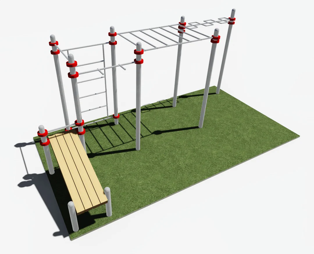 Составляющими данного комплекса являются шведская стенка, рукоход классиеский, рукоход змеевик, скамья для пресса, турники для подтягиваний. Шведская стенка крепится на высоте 2450 мм к опорному столбу высотой 2600 мм.