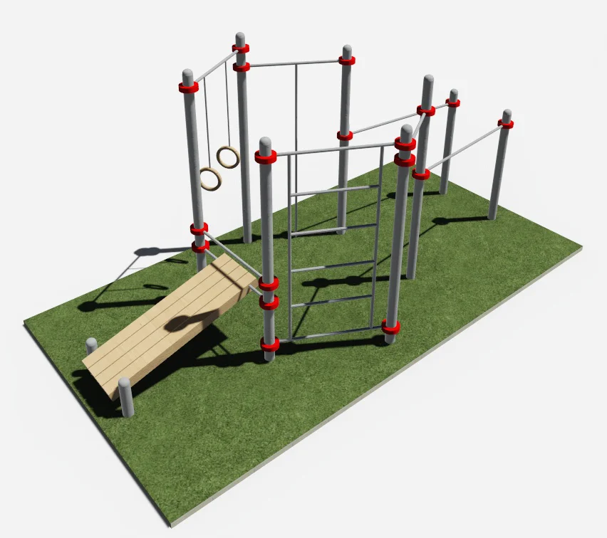 Данный мини-площадка включает в себя скамью для пресса, шведскую стенку, турник для подтягиваний, брусья, турник с кольцами и турник с канатом. Шведская стенка крепятся на высоте 2450 мм к опорным столбам высотой 2600 мм.