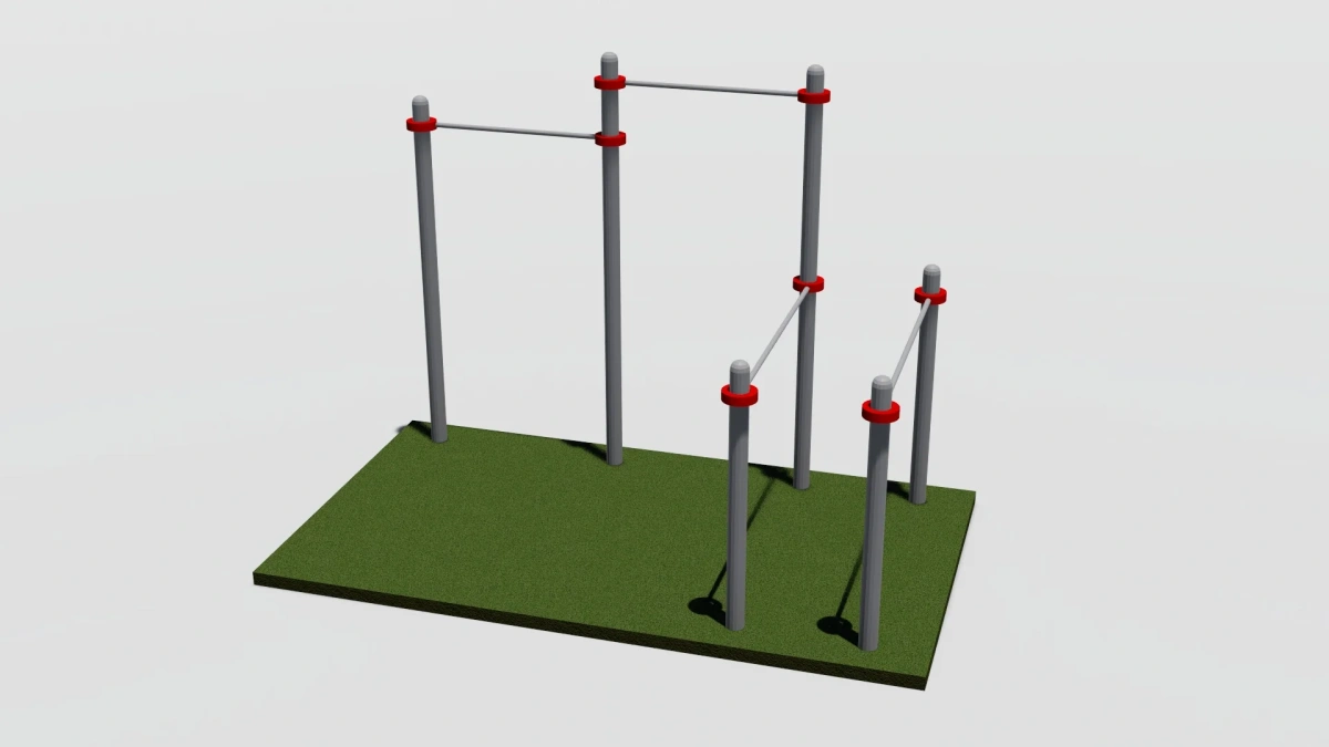 К опорным столбам высотой 2600мм, 2300мм в крепится с помощью хомутов на высоте от уровня основания: 2550 мм, 2400 мм перекладины турника шириной 1200 мм, брусья фиксируются на высоте 1400-1500 мм от уровня основания.